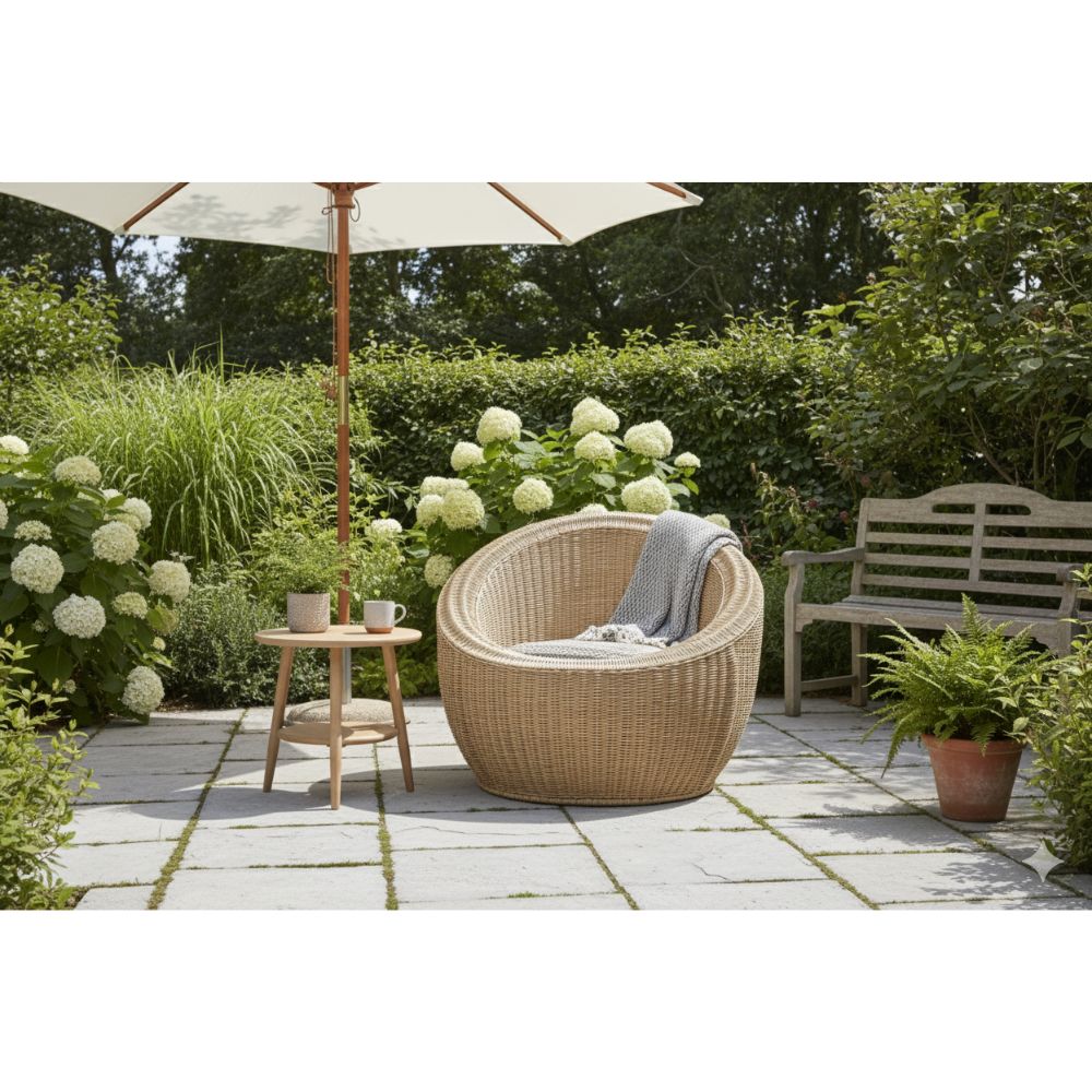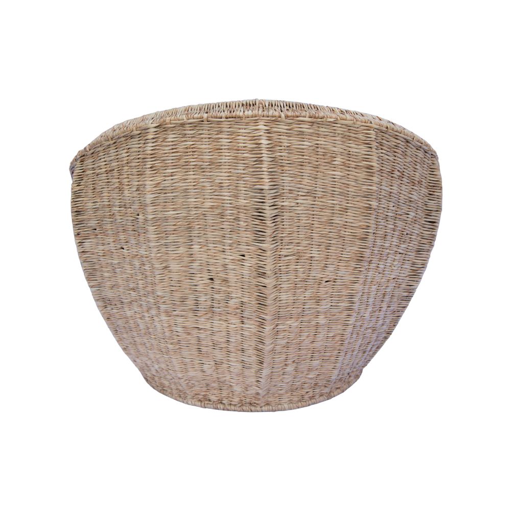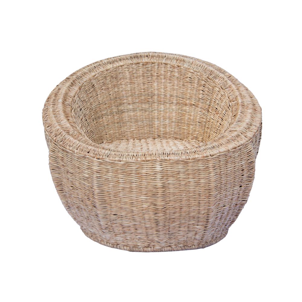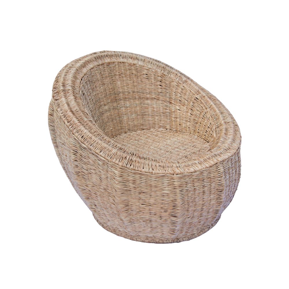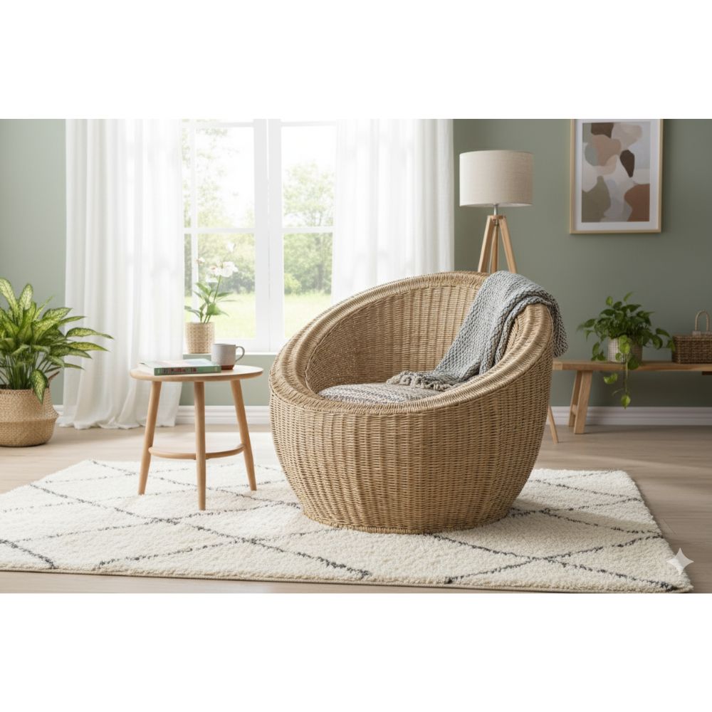 Cadeira redonda artesanal de palha de 1 Lugar de estilo rústico feita em vime com padrão trançado, estrutura própria e cor bege predominante. Ideal para ambientes internos e externos, oferece conforto com visual natural e artesanal. Requer cuidados com humidade e exposição solar para manter sua durabilidade.