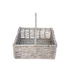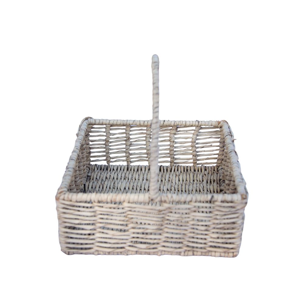 Cesto para cabaz quadrado artesanal de palha com acabamento trançado e alça central para transporte. Predominantemente bege, é ideal para organização de objetos ou uso decorativo em ambientes internos. Requer cuidados contra humidade e exposição solar para manter sua forma e durabilidade.