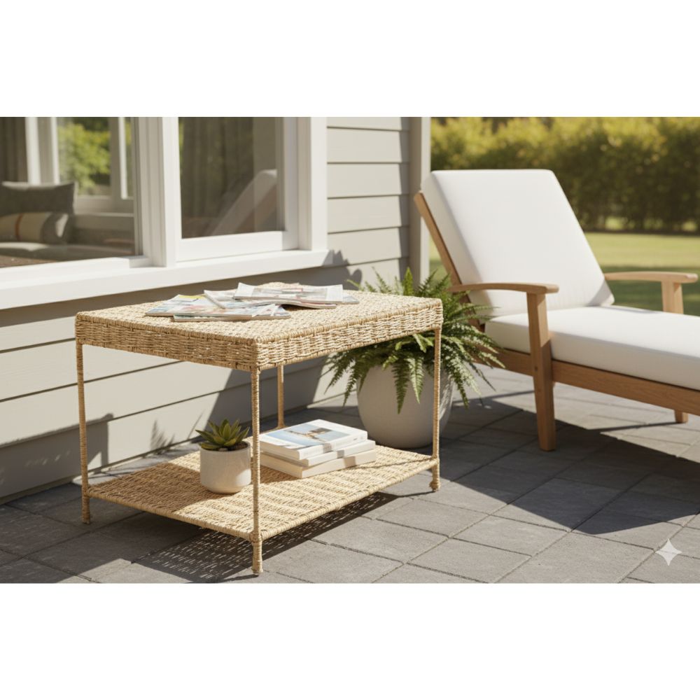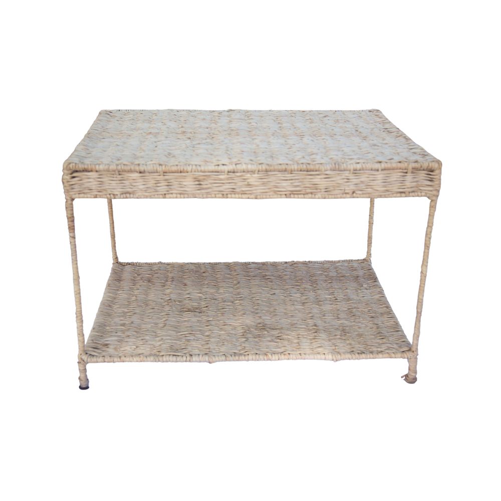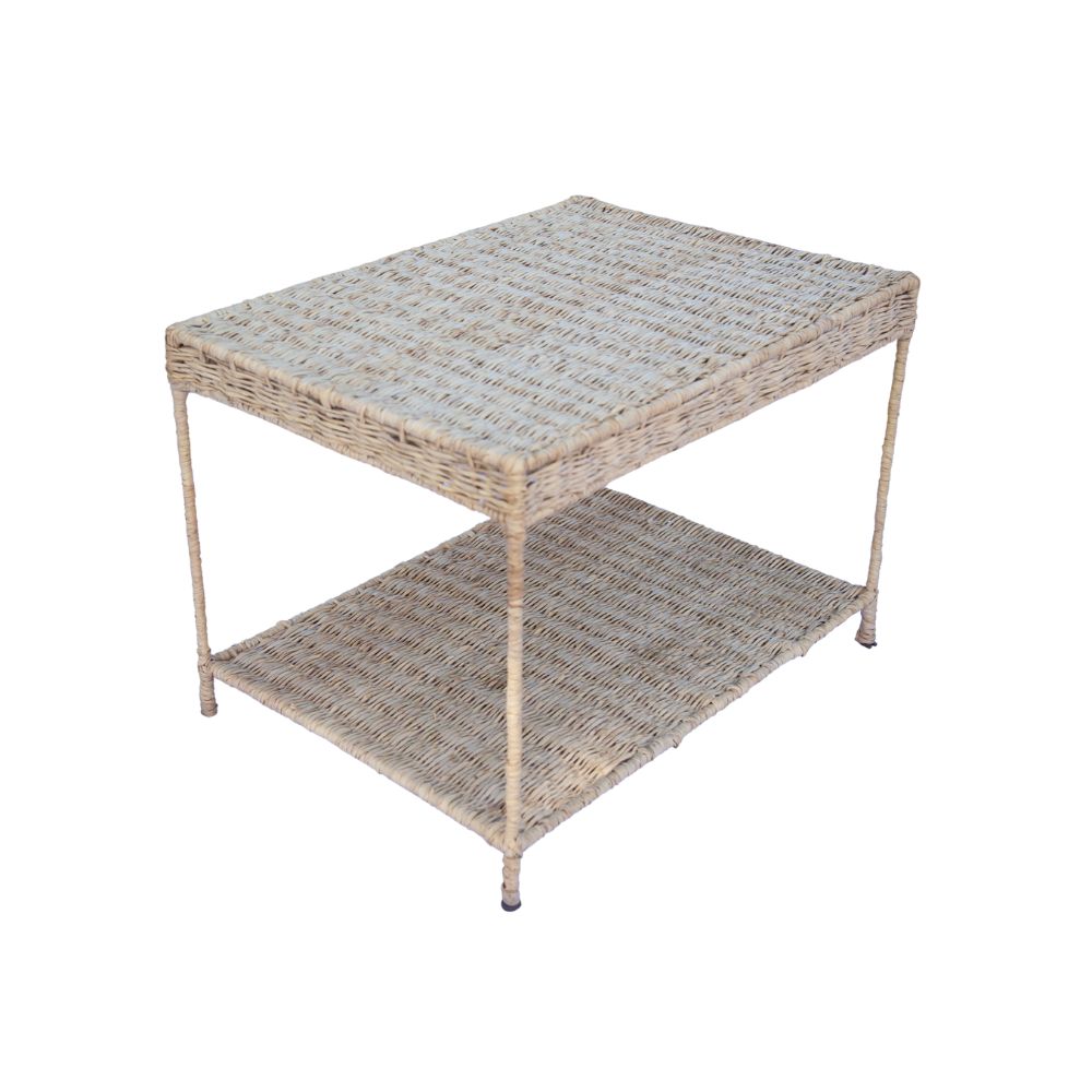 Mesinha Retangular artesanal de palha com estrutura metálica, acabamento trançado e dois níveis (tampo superior e prateleira inferior). Predominantemente bege, é ideal para salas, quartos ou áreas externas cobertas, oferecendo funcionalidade e estilo rústico. Requer cuidados contra humidade e exposição solar prolongada para maior durabilidade.