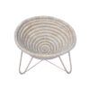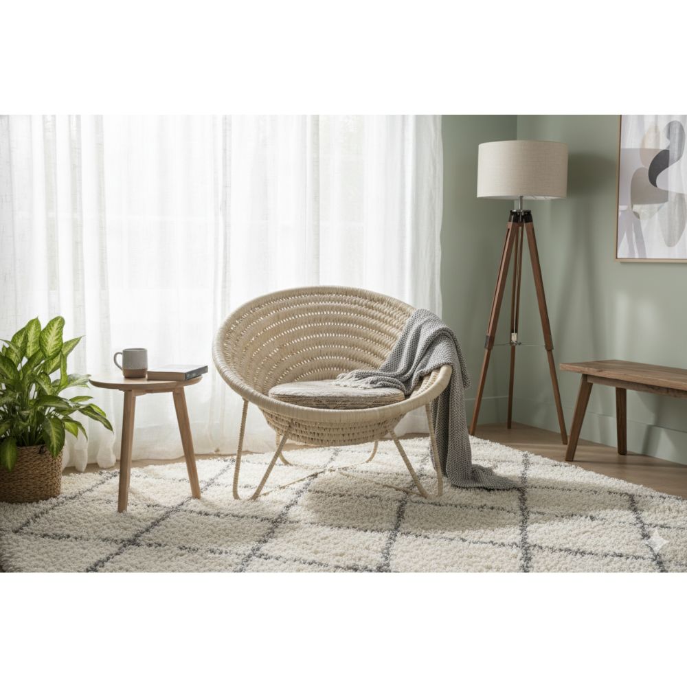 Handmade straw chair Oval Bottom, made with natural fiber braided in a circular pattern, supported by a metal structure. Predominantly beige, it is indicated for use in indoor and outdoor covered areas. It combines handmade aesthetics with lightness and comfort, requiring care against humidity and prolonged sun exposure.