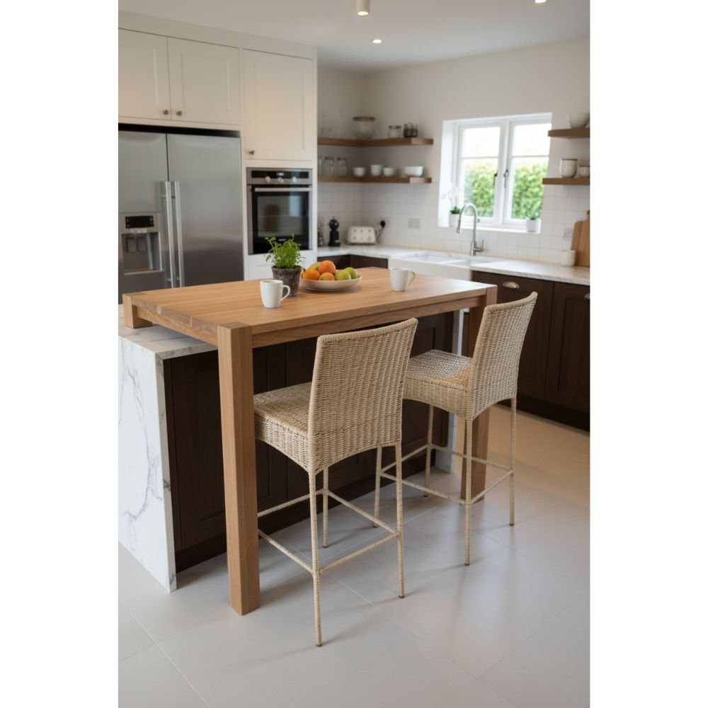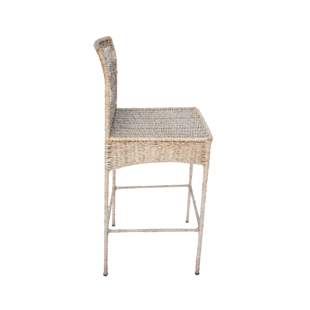 Handmade straw bar chair with metal structure, braided finish and predominant beige color. Ideal for counters, bars or kitchens, offering a rustic and elegant touch to the environment. It requires care against humidity and prolonged sun exposure to ensure greater durability.