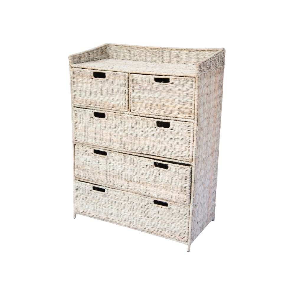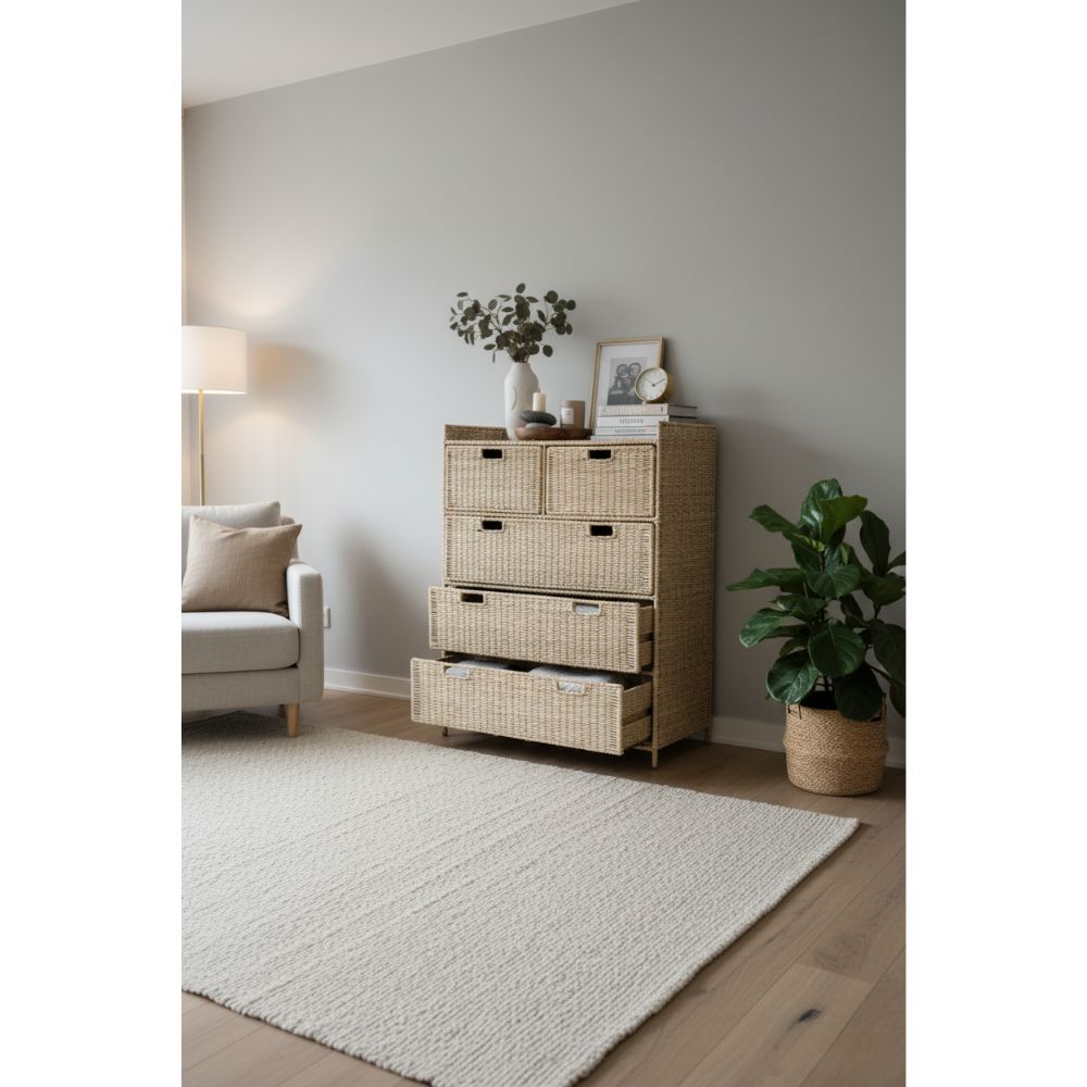 Handmade straw dresser with 5 drawers, made of braided natural fibers, with a light and resistant structure. Finish in natural beige tone, ideal for indoor environments such as bedrooms or living rooms, offering functionality and rustic and boho style.