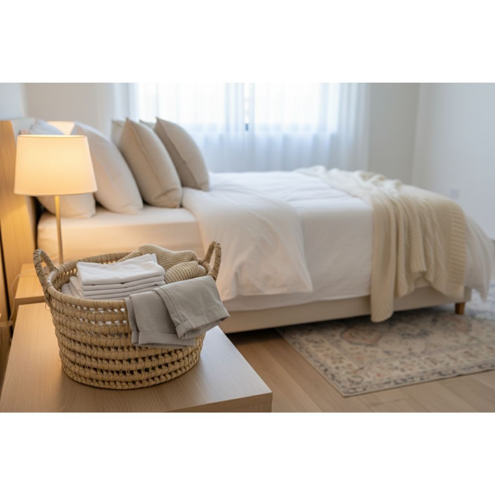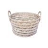 Handmade straw fruit basket with two side handles, made of natural fibers with an open weave in horizontal rings. Firm structure and rustic design, ideal for storing light clothes, toys or fruits, as well as serving as a decorative piece. Predominant color: natural beige.