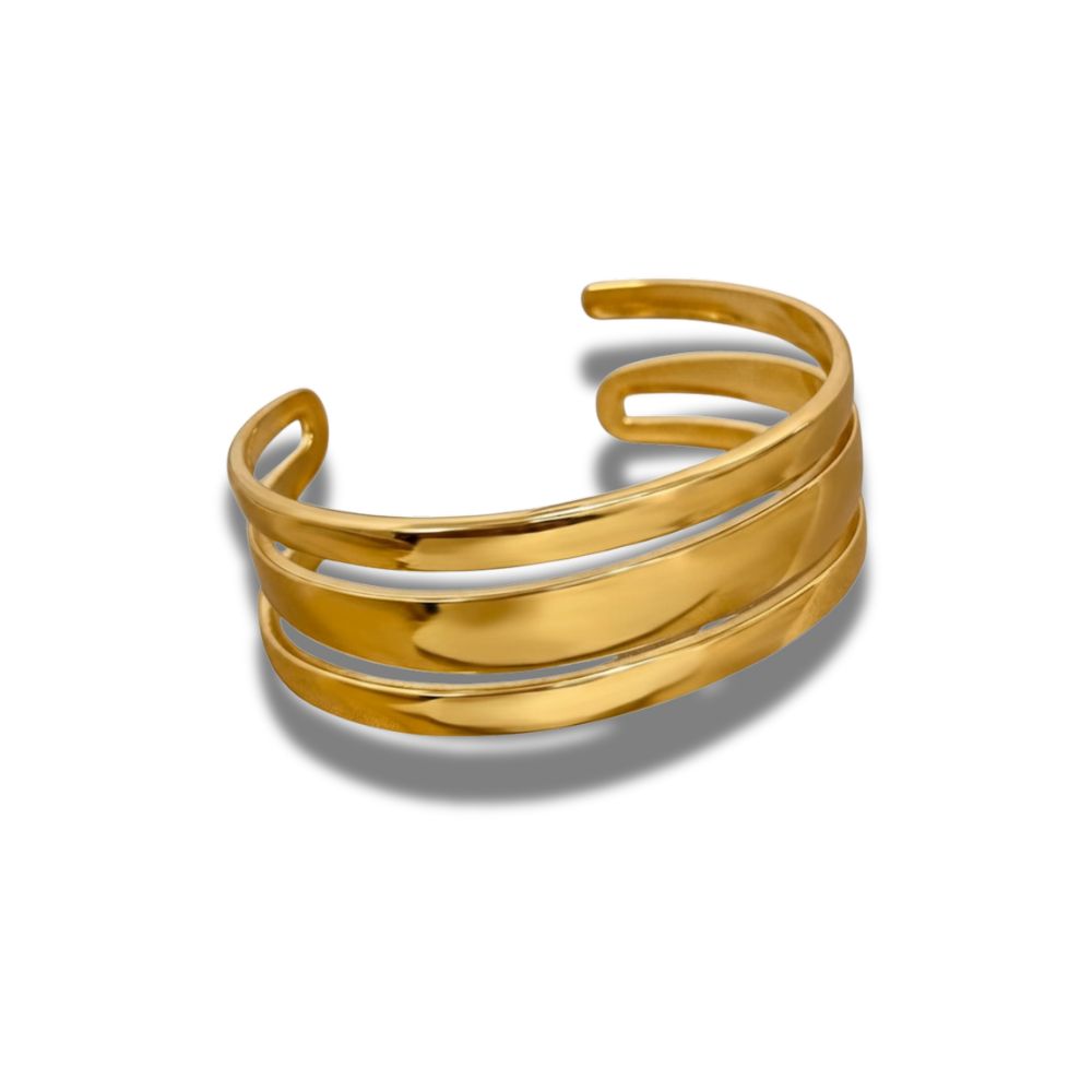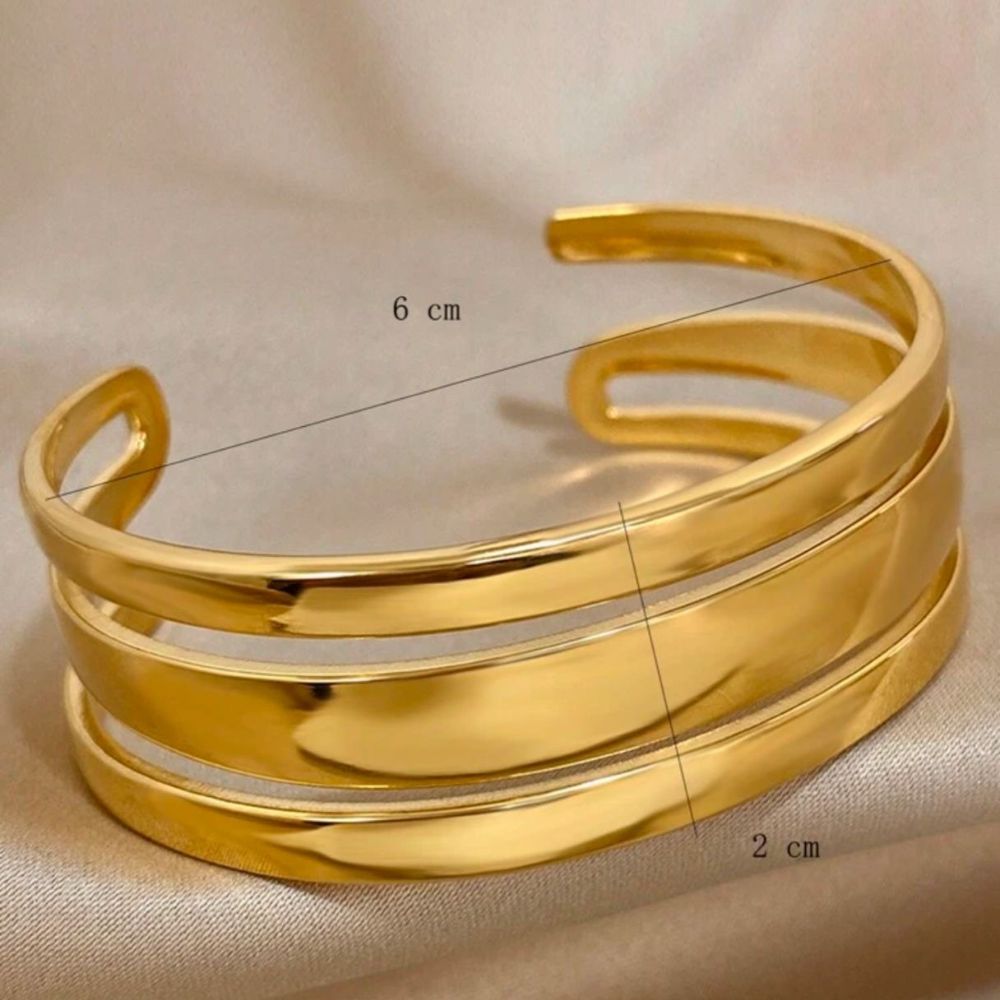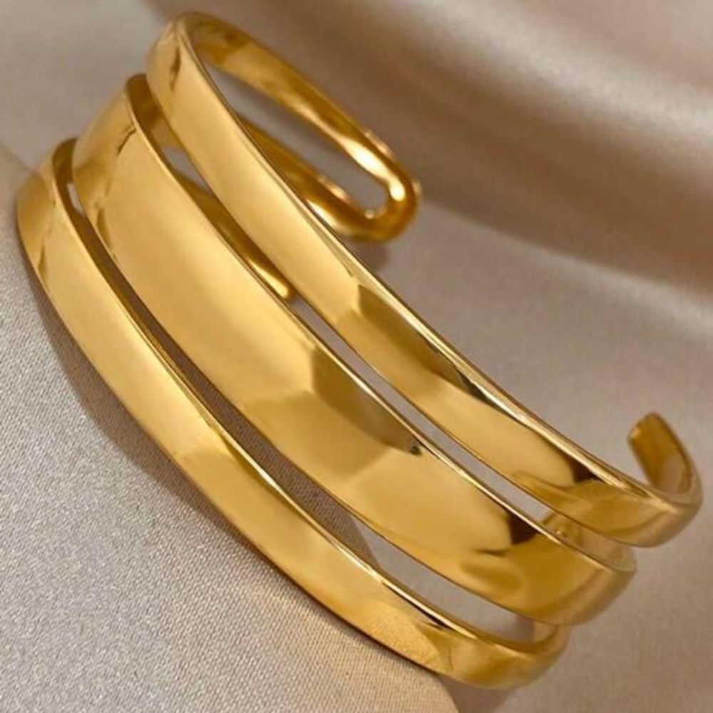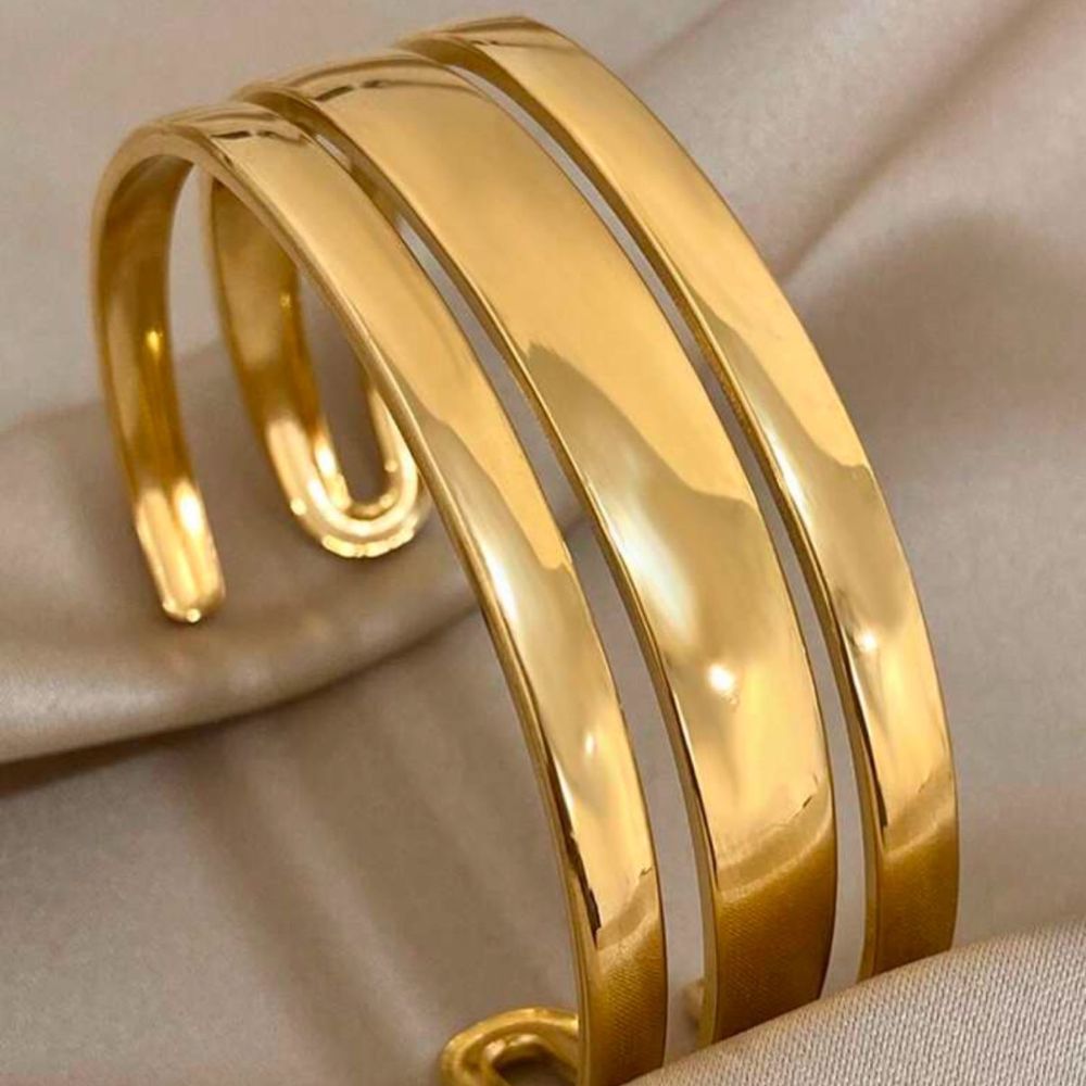 Adjustable stainless steel bracelet with gold finish and elegant triple design. Corrosion resistant, hypoallergenic and durable, ideal for daily use or special occasions. Comfortable fit for different wrist sizes, combining sophistication and modern style.