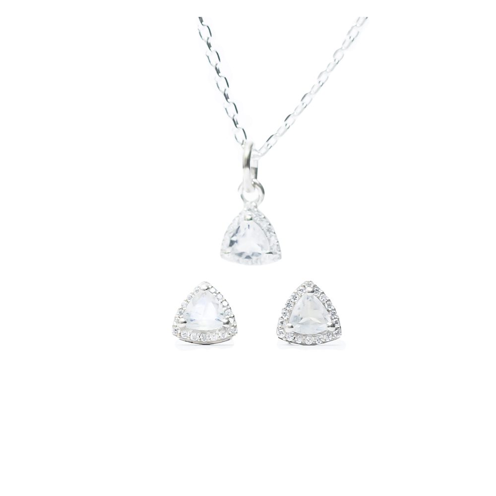 Delicate and charming, this moonstone jewelry set consists of earrings and necklace with an elegant triangular design and shiny zirconia finish. The moonstone, known for its soft, iridescent glow, conveys an aura of mystery and femininity. Ideal for those who value jewelry with sophisticated style and spiritual meaning, this set offers charm and lightness for both special occasions and daily use.
