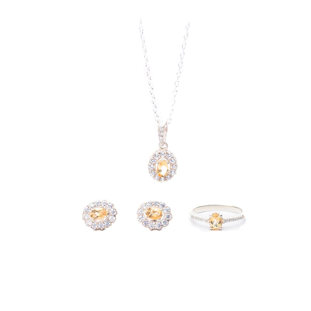 O Conjunto Elegance Citrino é a escolha ideal para quem busca elegância com um toque de cor vibrante. Este conjunto inclui um colar com pingente, um par de brincos e um anel, todos com pedra central oval de Citrino, cuidadosamente lapidada e envolta por cristais claros que realçam ainda mais o brilho da peça.