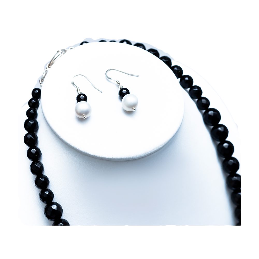 Este conjunto exclusivo é composto por um colar de contas facetadas de turmalina preta e um par de brincos combinando, criando uma composição elegante, clássica e atemporal.
