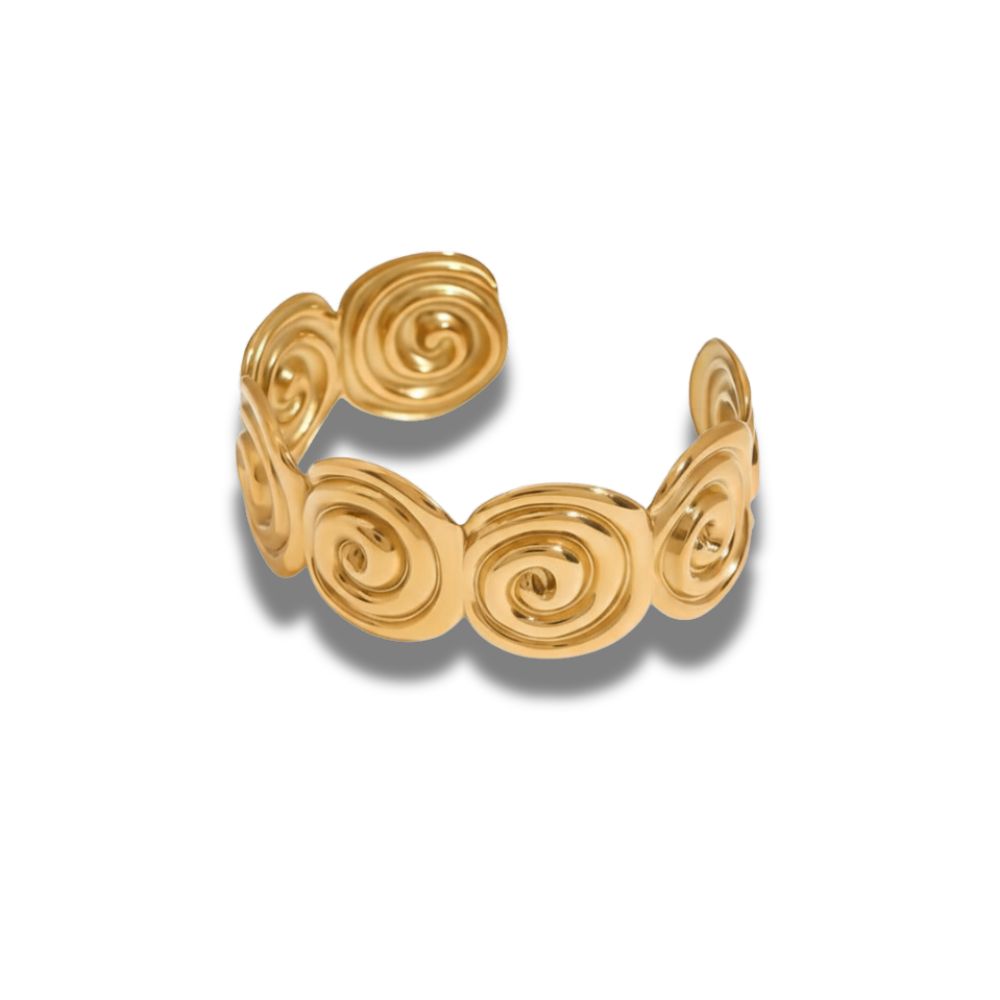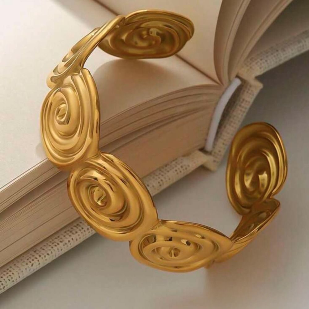 Bracelete ajustável em aço inoxidável com acabamento dourado e design espiral elegante. Resistente à água, hipoalergênico e durável, ideal para uso diário ou ocasiões especiais. Ajuste confortável para diferentes tamanhos de pulso, combinando estilo moderno e sofisticação.