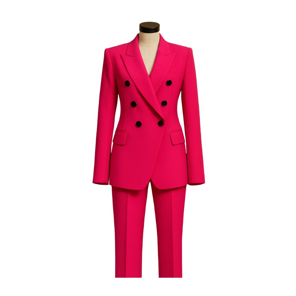 The women’s tailoring set in vibrant pink is a bold and sophisticated choice for modern women who want to stand out with elegance. Consisting of a structured double-breasted blazer and straight-cut trousers, the set provides an impeccable fit, ideal for formal occasions, meetings or social events.